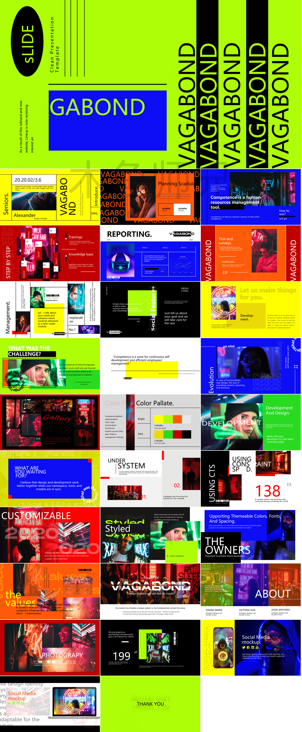 61套酸性故障风PPT模板免费打包下载;这是一批酸性故障风格的PPT模板,设计独特,色彩鲜明。模板的背景以酸性绿为基调,配以亮黄和橙色的花