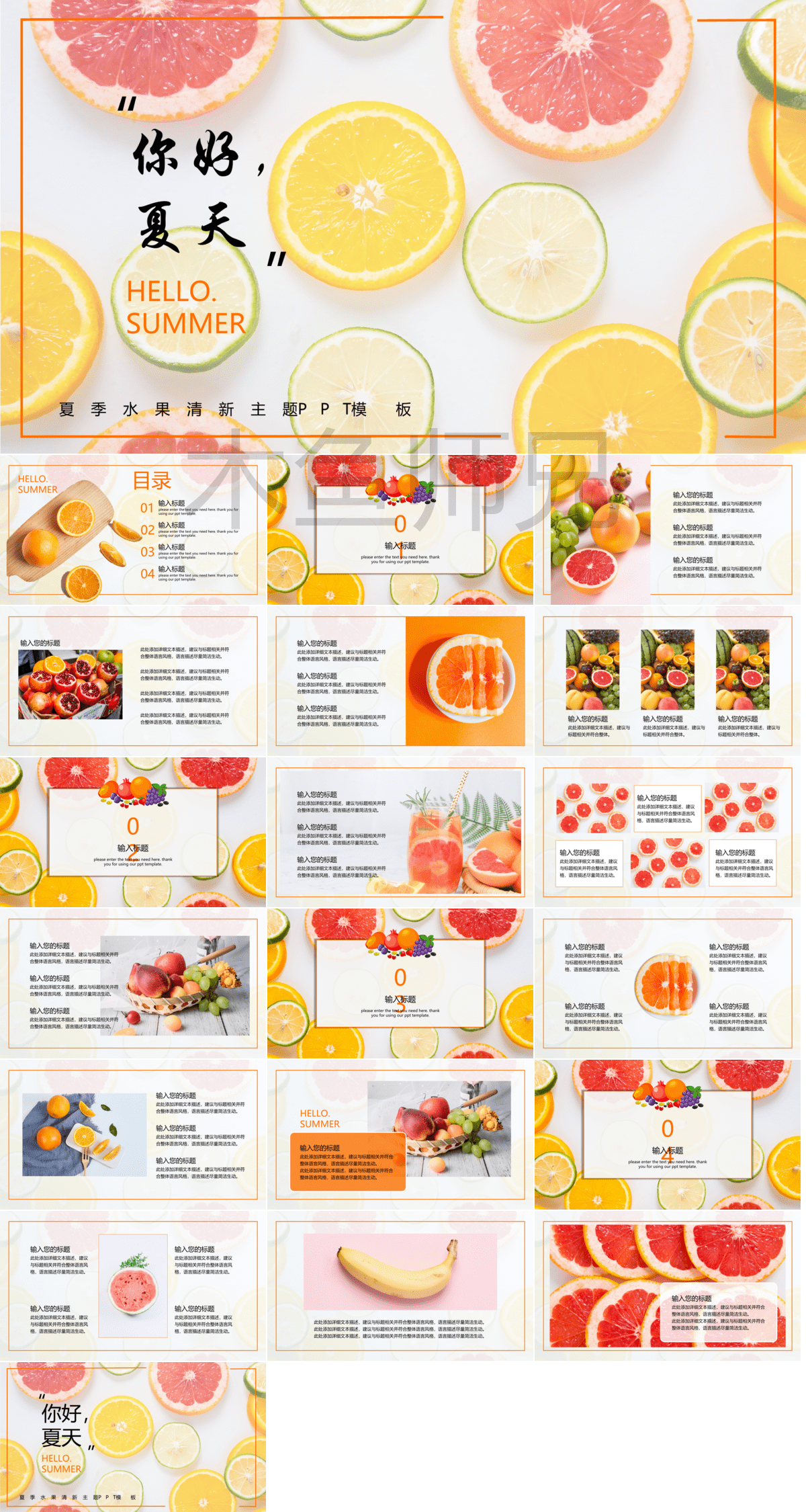 93套清新夏日PPT模板免费打包下载;包括了:夏天你好PPT、夏季清新西瓜风PPT、夏天的味道PPT、小清新工作计划PPT、大海边的沙滩PPT、仲夏PP