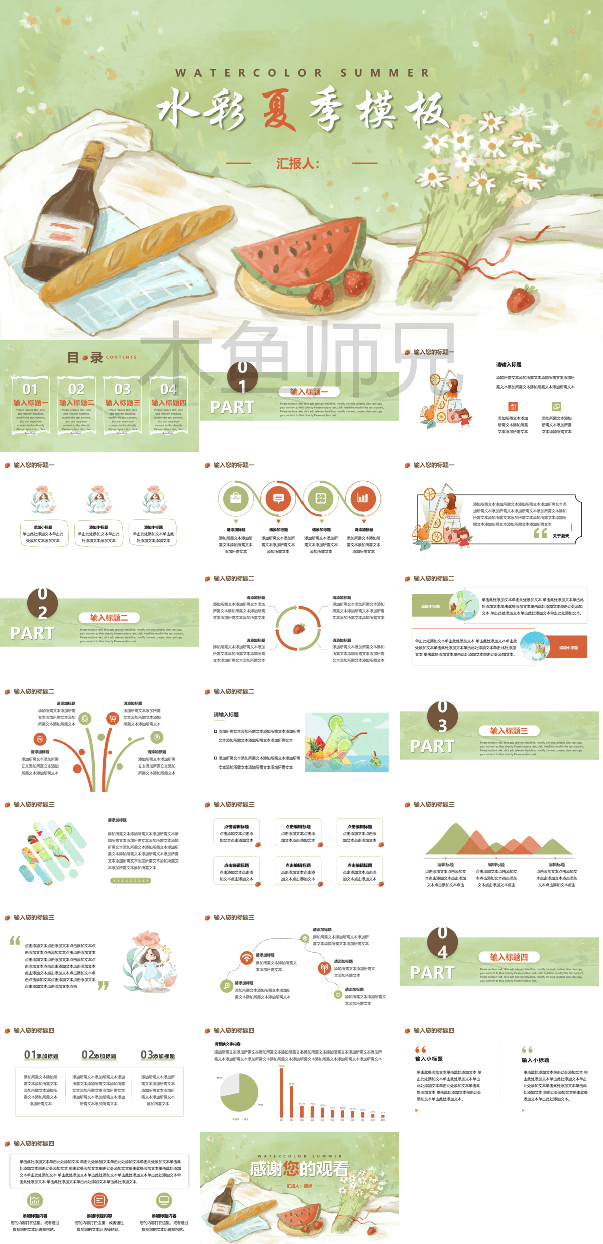 93套清新夏日PPT模板免费打包下载;包括了:夏天你好PPT、夏季清新西瓜风PPT、夏天的味道PPT、小清新工作计划PPT、大海边的沙滩PPT、仲夏PP