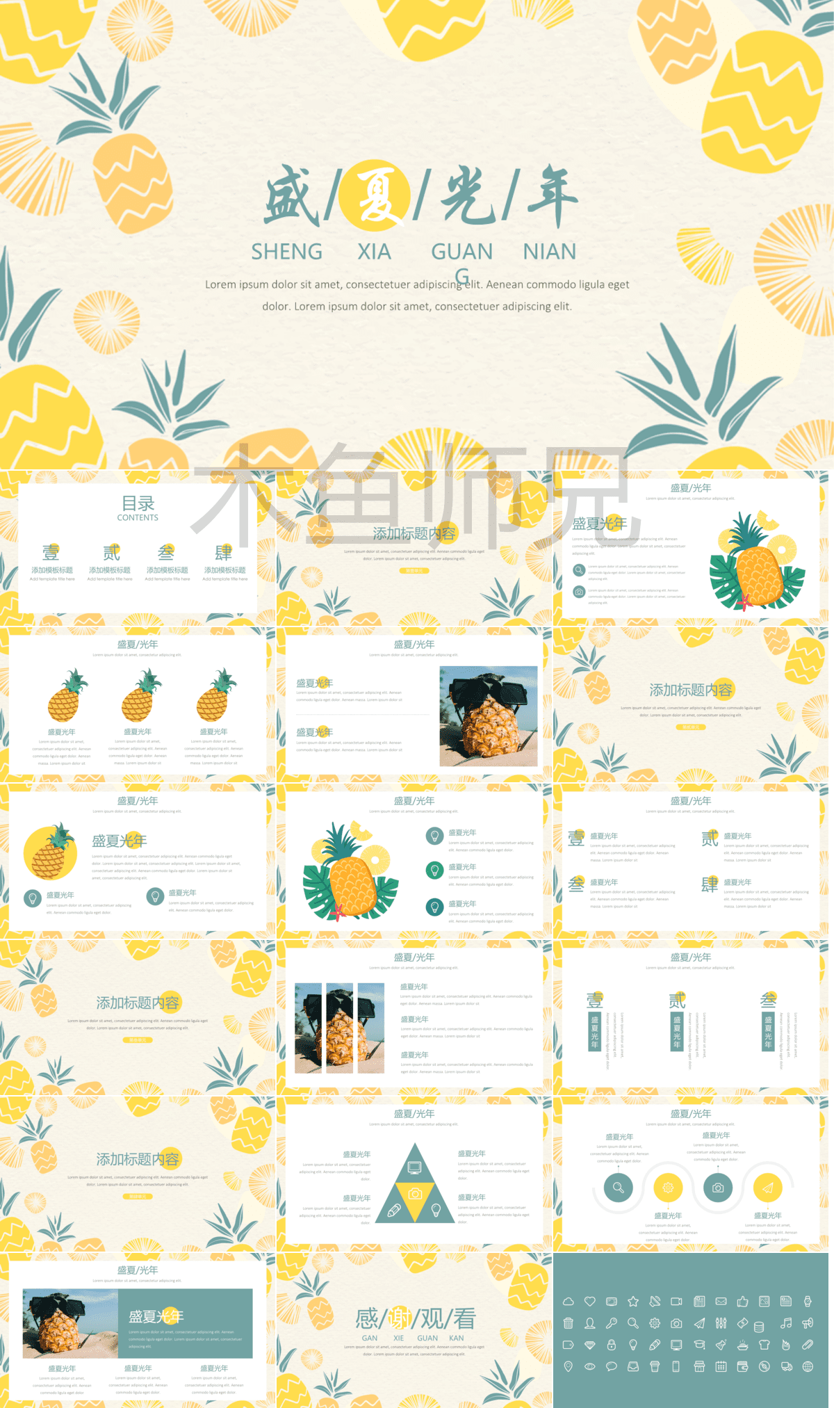 93套清新夏日PPT模板免费打包下载;包括了:夏天你好PPT、夏季清新西瓜风PPT、夏天的味道PPT、小清新工作计划PPT、大海边的沙滩PPT、仲夏PP