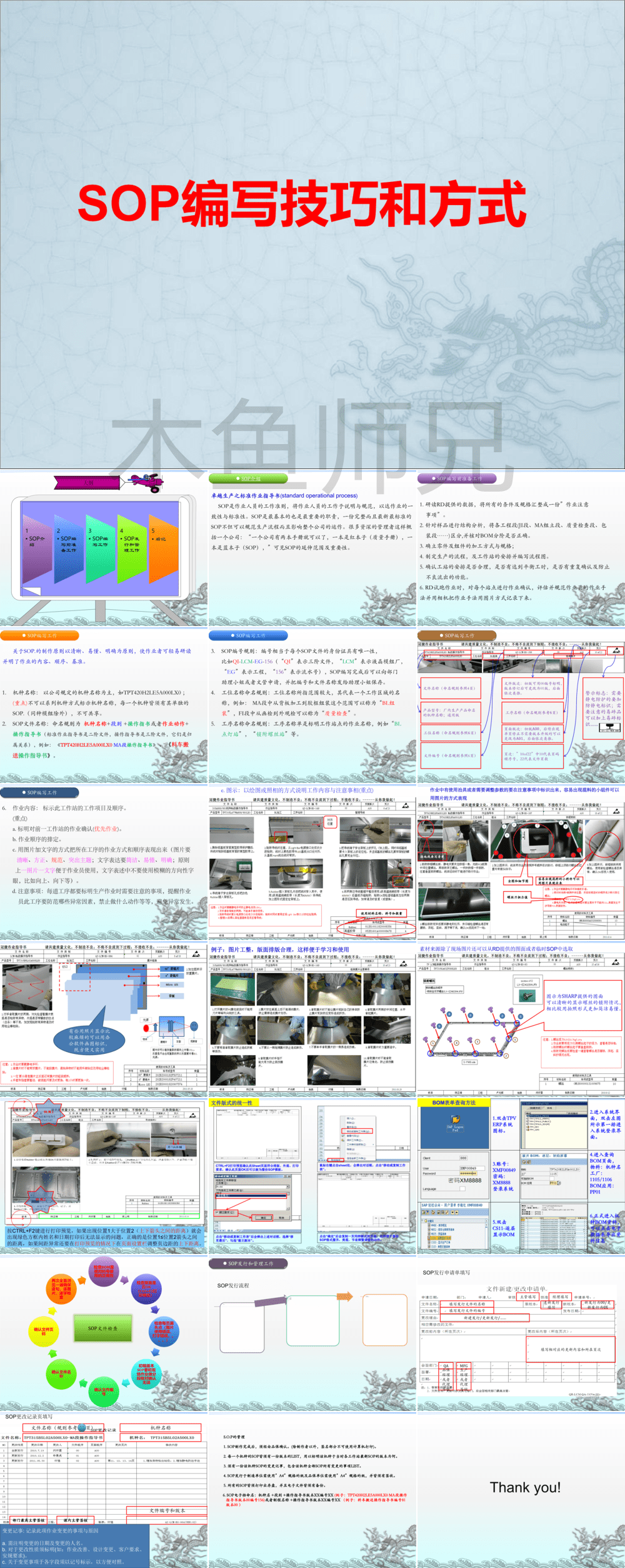 SOP 编写技巧:需研读研发(RD)提供的数据,把所有条件和规格整理成 “作业注意事项”。建议拆解 2 件样品进行结构分析,梳理各工程段,如 MA 组装段、建置段、包装段等信息,以此为编写 SOP 积累资料。