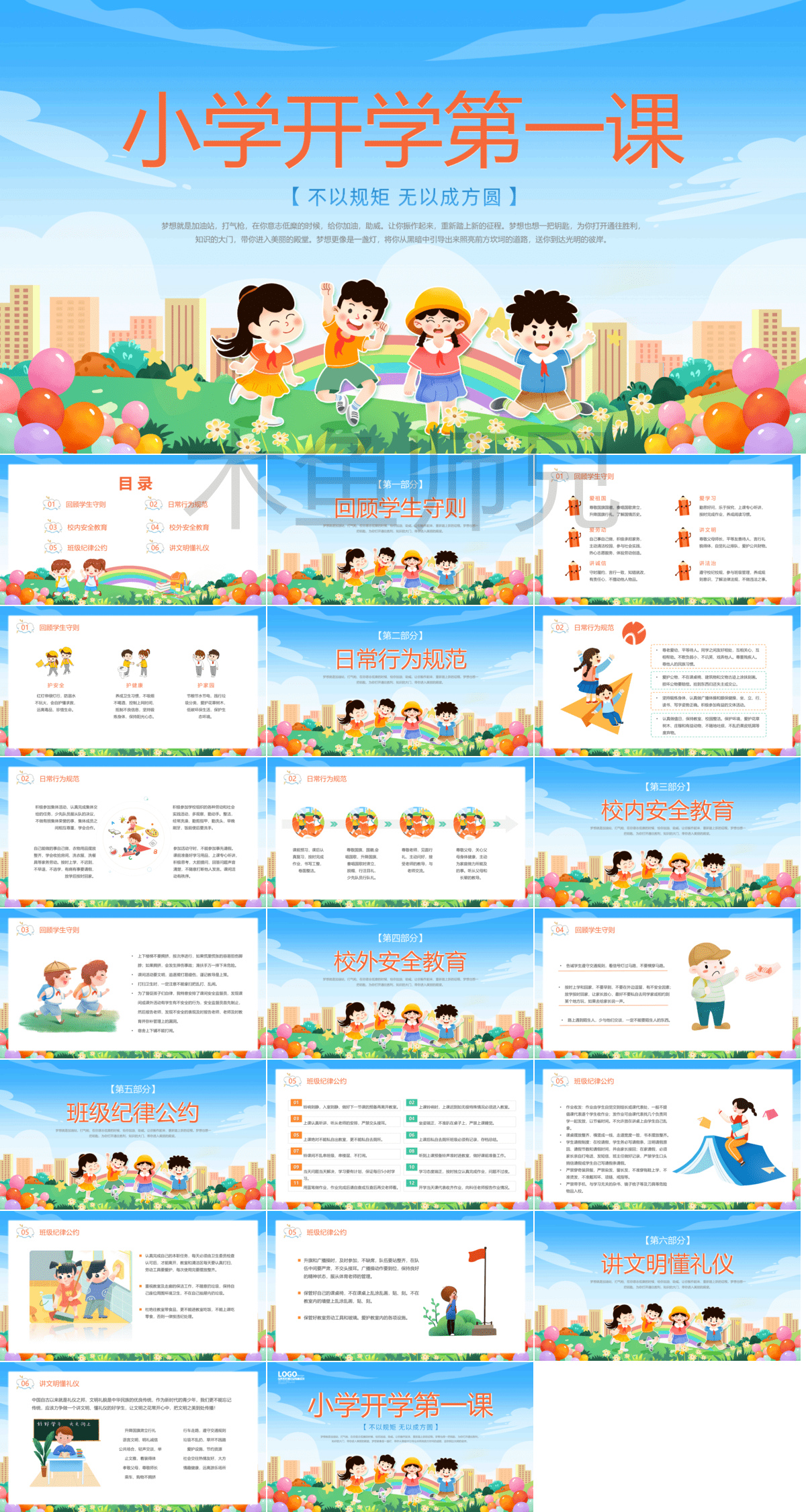 41套开学立规矩开学第一课PPT模板免费打包下载;包括了:开学第一课PPT、小学生日常行为规范PPT、开学立规矩PPT、学习校规校纪PPT、行为规