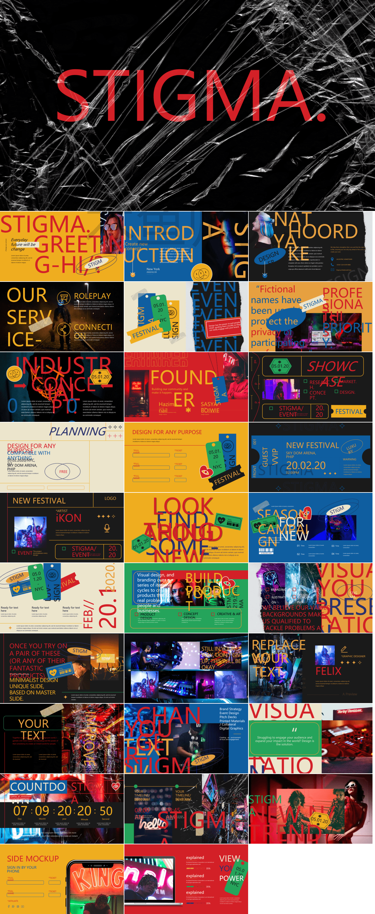 61套酸性故障风PPT模板免费打包下载;这是一批酸性故障风格的PPT模板,设计独特,色彩鲜明。模板的背景以酸性绿为基调,配以亮黄和橙色的花