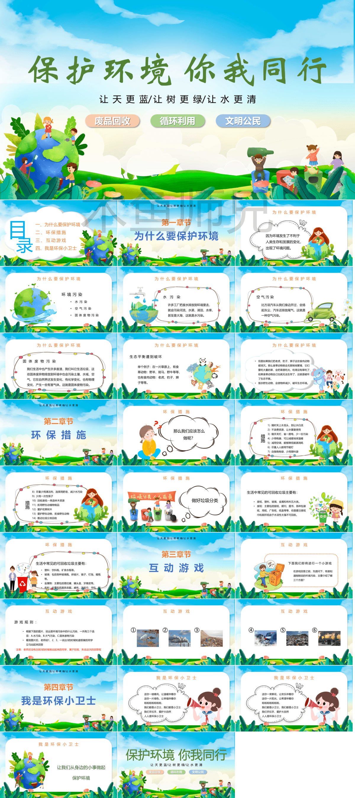 110套环保主题PPT模板免费打包下载;包括了:爱护环境低碳出行PPT、低碳环保PPT、节约用水保护环境PPT、垃圾分类呵护花园PPT、珍惜点滴节约