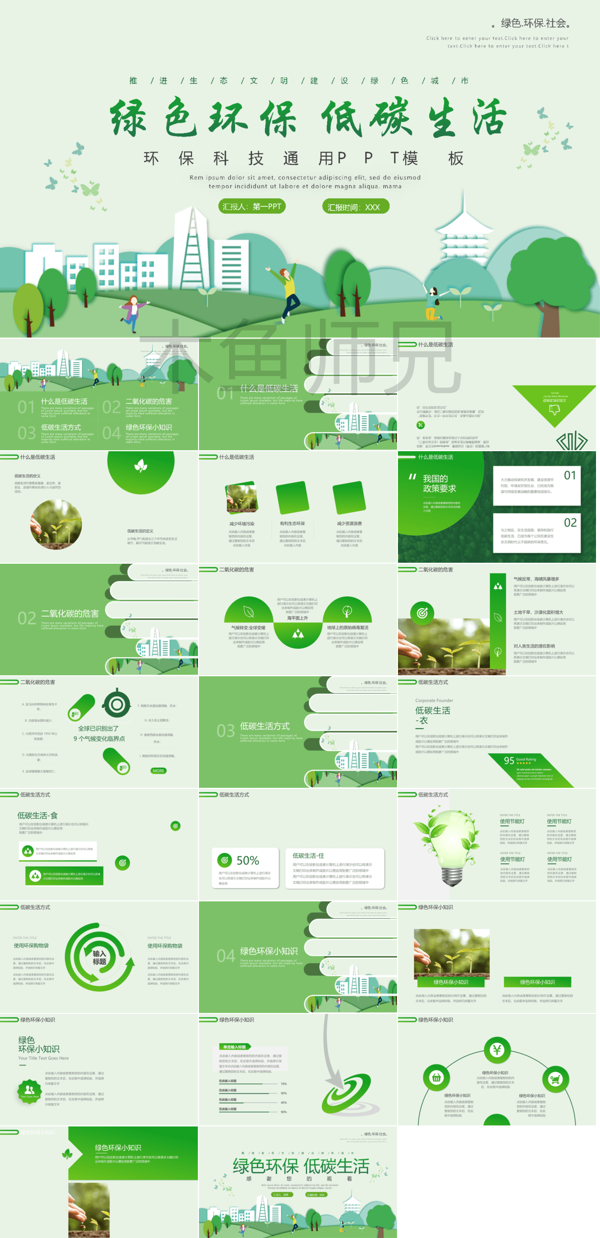 110套环保主题PPT模板免费打包下载;包括了:爱护环境低碳出行PPT、低碳环保PPT、节约用水保护环境PPT、垃圾分类呵护花园PPT、珍惜点滴节约