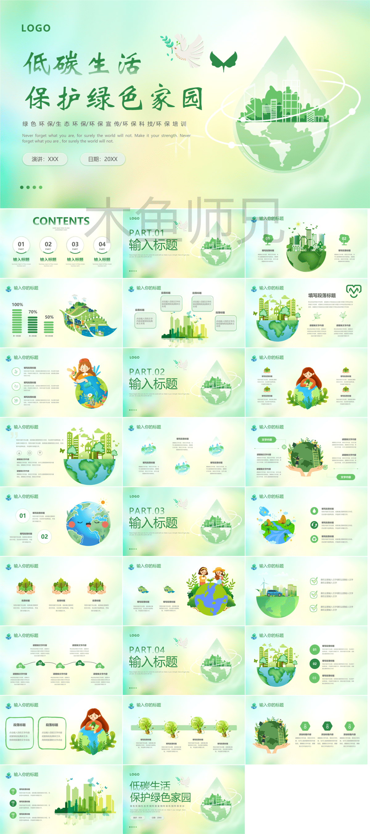 110套环保主题PPT模板免费打包下载;包括了:爱护环境低碳出行PPT、低碳环保PPT、节约用水保护环境PPT、垃圾分类呵护花园PPT、珍惜点滴节约