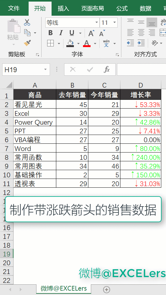 | 51 | 050-单元格格式-制作带涨跌箭头的销售数据.GIF | 揍我 | 单元格格式 | 制作带涨跌箭头的销售数据 |