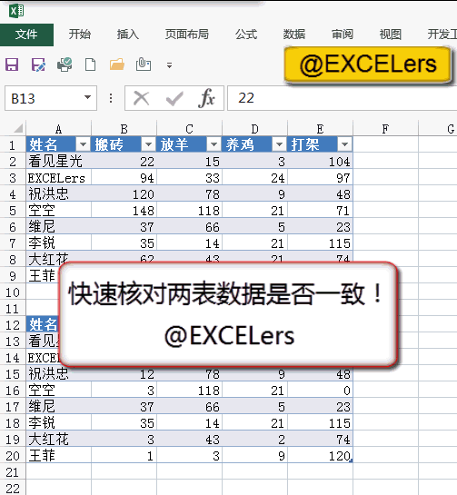 | 155 | 154-条件格式-快速核对两表不一致之处.GIF | 揍我 | 条件格式 | 快速核对两表不一致之处 |