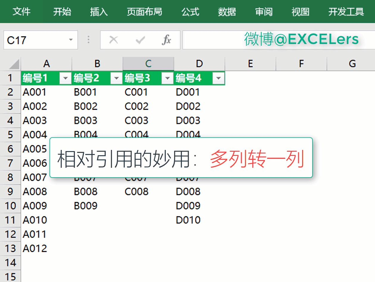 | 212-常用函数-相对引用的妙用,多列转一列.GIF | 揍我 | 常用函数 | 相对引用的妙用,多列转一列 |