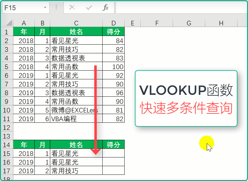 | 232-常用函数-VLOOKUP多条件查询.GIF | 揍我 | 常用函数 | VLOOKUP多条件查询 |