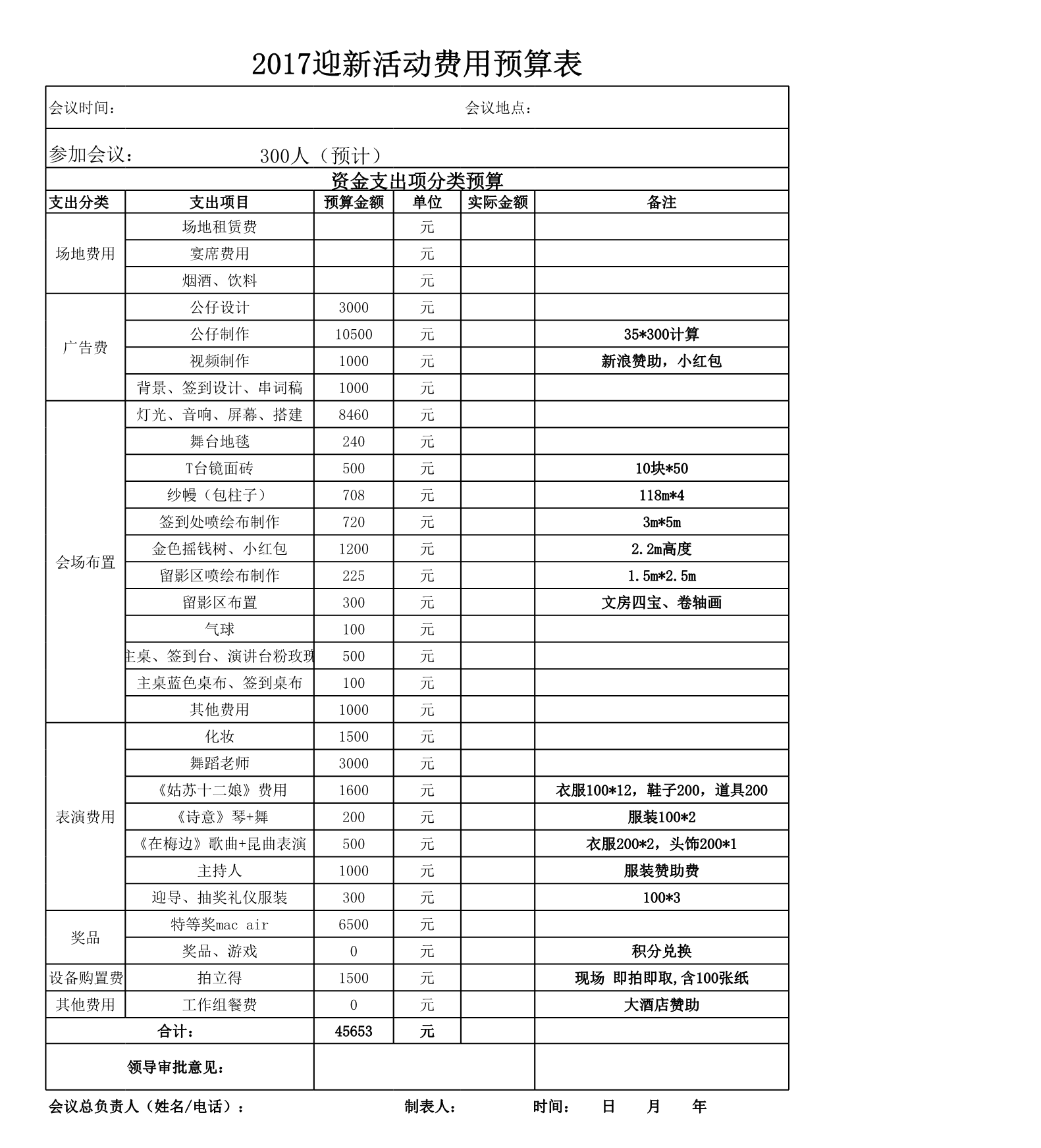 声明:本信息来源于【年会费用预算表】2017年会活动费用预算表.xlsx,仅用于学习和技术交流,如有侵权或其他问题,请联系本站处理。