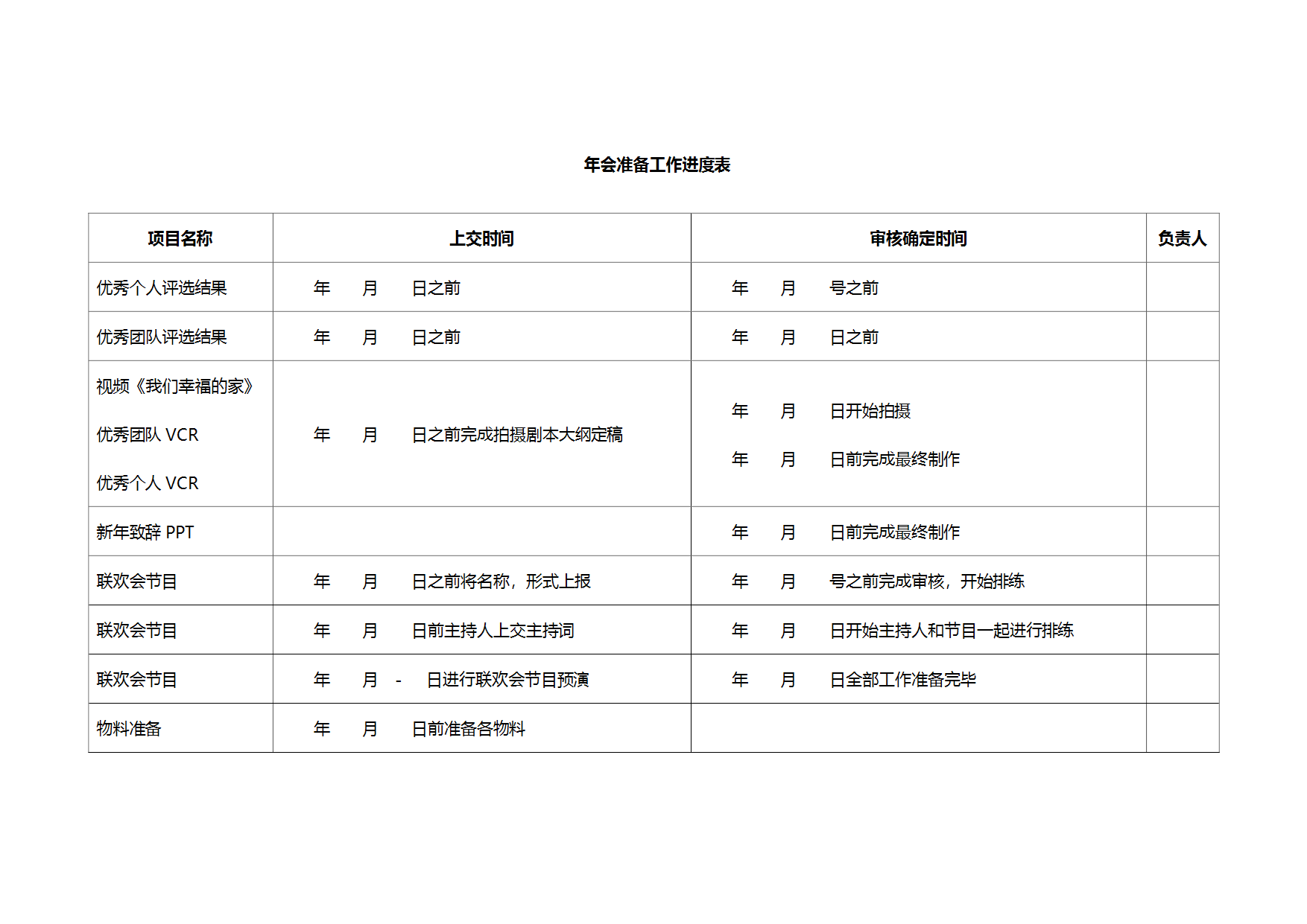 声明:本信息来源于【年会活动流程】年会准备工作进度表.doc,仅用于学习和技术交流,如有侵权或其他问题,请联系本站处理。