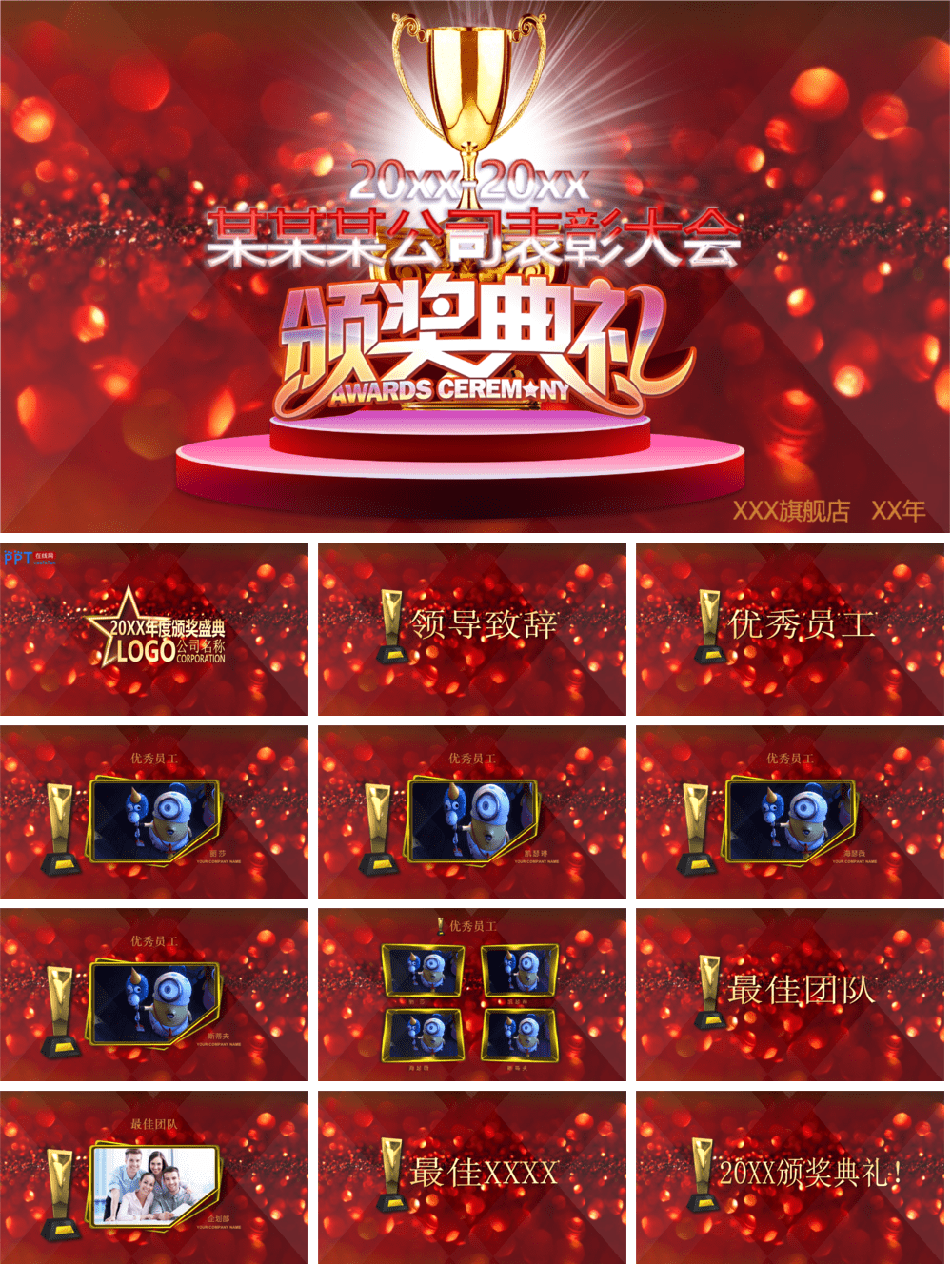 请注意,年会颁奖视频PPT文件都很大,少则30~50MB,多则300MB,尽量在电脑上预览效果图以及下载PPT源文件。