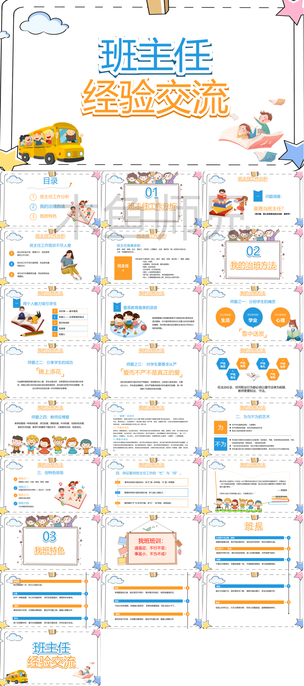 本PPT主要围绕班主任工作展开,核心内容涵盖班主任工作分析、治班方法以及特色班级创建等方面,具体总结如下: