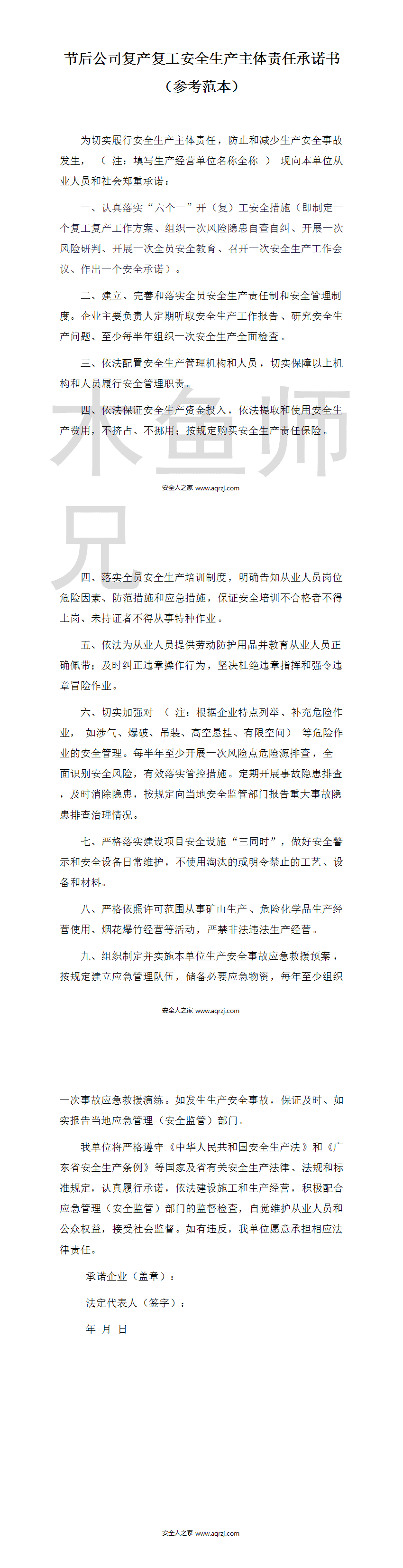 节后公司复产复工安全生产主体责任承诺书(参考范本).docx