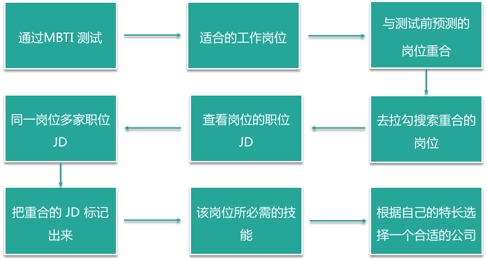 若想了解其他具体的岗位详情,建议可通过 MBTI 的测试来了解自己擅长的工作岗位,相信测试完后的结果与测试前的认知岗位会有重合。此时,可以通过拉勾网站去搜索密切度高的岗位,然后查看该岗位的职位 JD,建议搜索查看同一岗位的多家职位 JD,把 JD 重合的部分标记出来,其实这些就是该岗位所必需的技能;当然了,多家职位 JD 也有不同的要求,这时可根据自己擅长的点和过往的经历来选出最合适的公司。